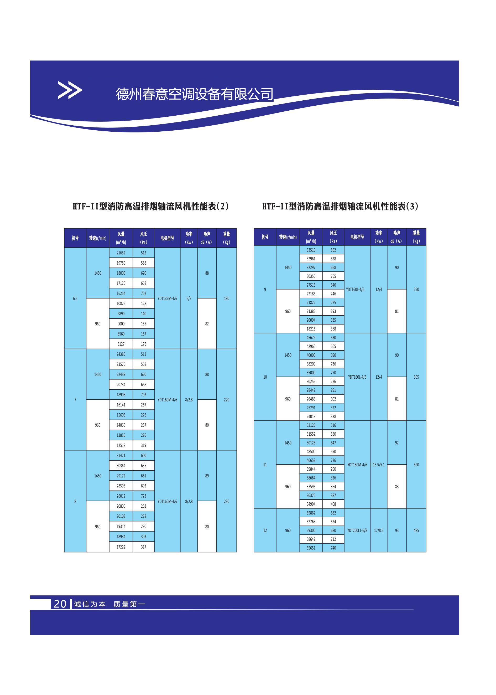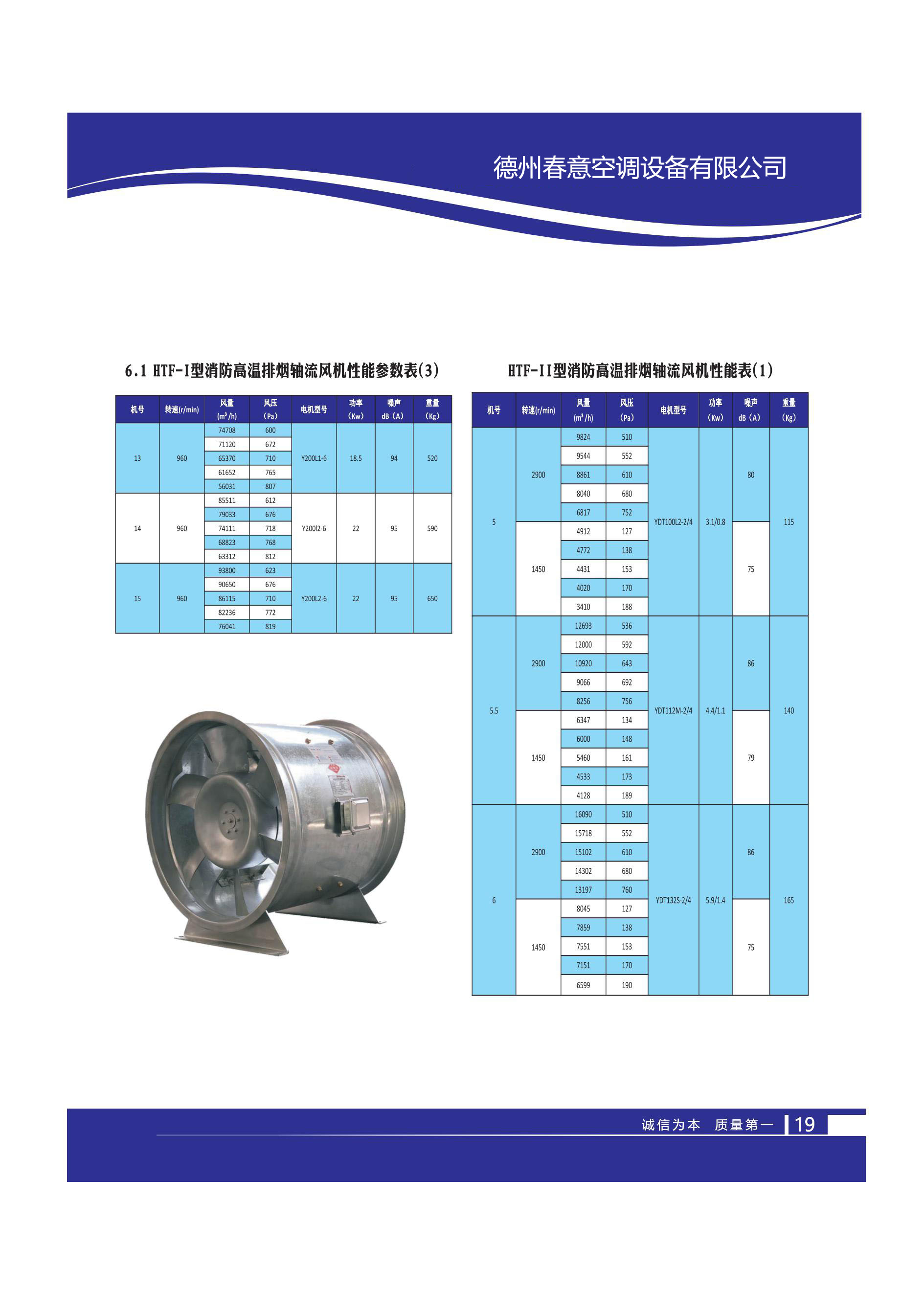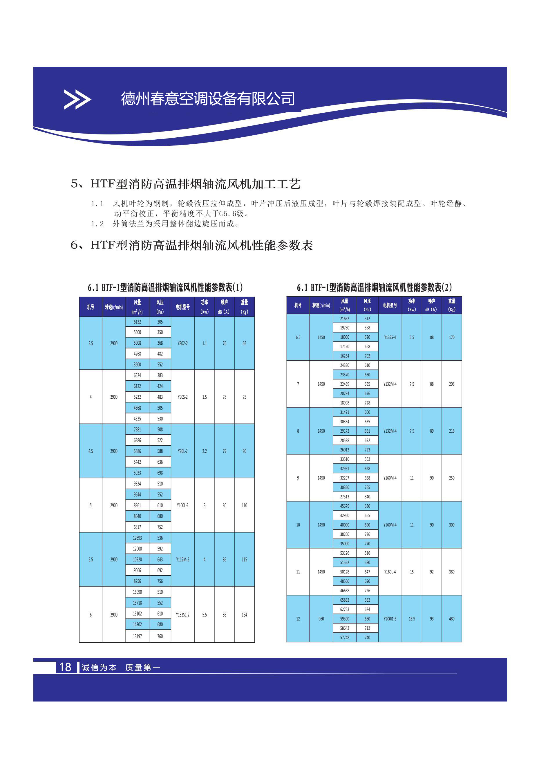 德州春意空調(diào)設(shè)備有限公司的 HTF - II 型消防高溫排煙軸流風(fēng)機(jī)性能表(2)和(3),涵蓋了機(jī)號(hào) 6.5 至 12 的風(fēng)機(jī)在不同轉(zhuǎn)速(如 1450/min、960/min)下的關(guān)鍵參數(shù),包括風(fēng)量(范圍從 7127m3/h 到 65862m3/h)、風(fēng)壓(128Pa 至 840Pa)、電機(jī)型號(hào)(如 YDT132M - 4/6、YDT200L1 - 6/8)、功率(部分標(biāo)注為 12/4Kw 等)、噪聲(80dB (A) 至 93dB (A))以及重量(180Kg 至 485Kg),體現(xiàn)了該系列風(fēng)機(jī)的性能差異與規(guī)格特點(diǎn)。